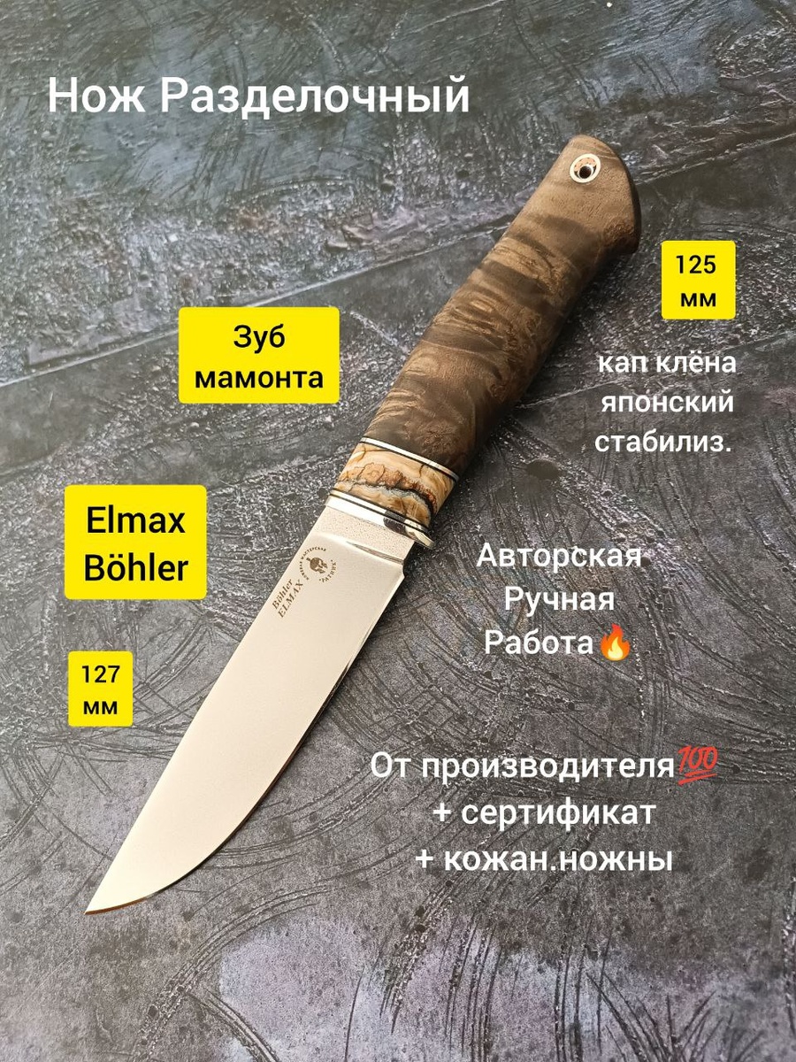 ‼️Elmax Böhler ❗пескоструй полированный 🔥4 мм в обухе❗ Всадной монтаж, хвостовик 80 мм Вес ножа - 165 гр. Рукоять - японский кап клёна стабилизир. - зуб мамонта стабилизир. - мозаичный пин с отверстием Клинок - Термо- + Крио- обработка, 63 HRC Ножны - нат.кожа двойной подвес (или любые под заказ) 🔥СКИДКА 🔥16.000 ₽🔥