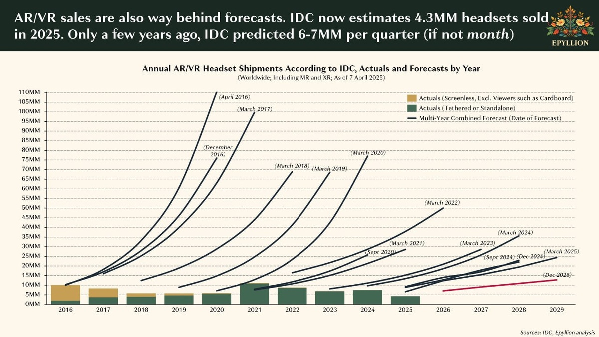 Игровой аналитик Мэтью Болл опубликовал фрагмент ежегодного отчёта, в котором сравнил прогнозы IDC с фактическими поставками VR-гарнитур. График показал, что отчёты IDC предсказывали быстрый рост рынка, однако реальные поставки устройств снижались последние четыре года и в 2025 году достигли минимума за шесть лет. — «Именно на прогнозы IDC долгое время опирались СМИ, заявляя то о скором крахе VR-индустрии, то о её неизбежном взрывном росте». Аналитики отметили, что подобные отчёты часто использовались стартапами для привлечения инвестиций, несмотря на отсутствие подтверждения роста со стороны реальных продаж. https://dzen.ru/id/5c0e38ff46ef5c00aaa80527