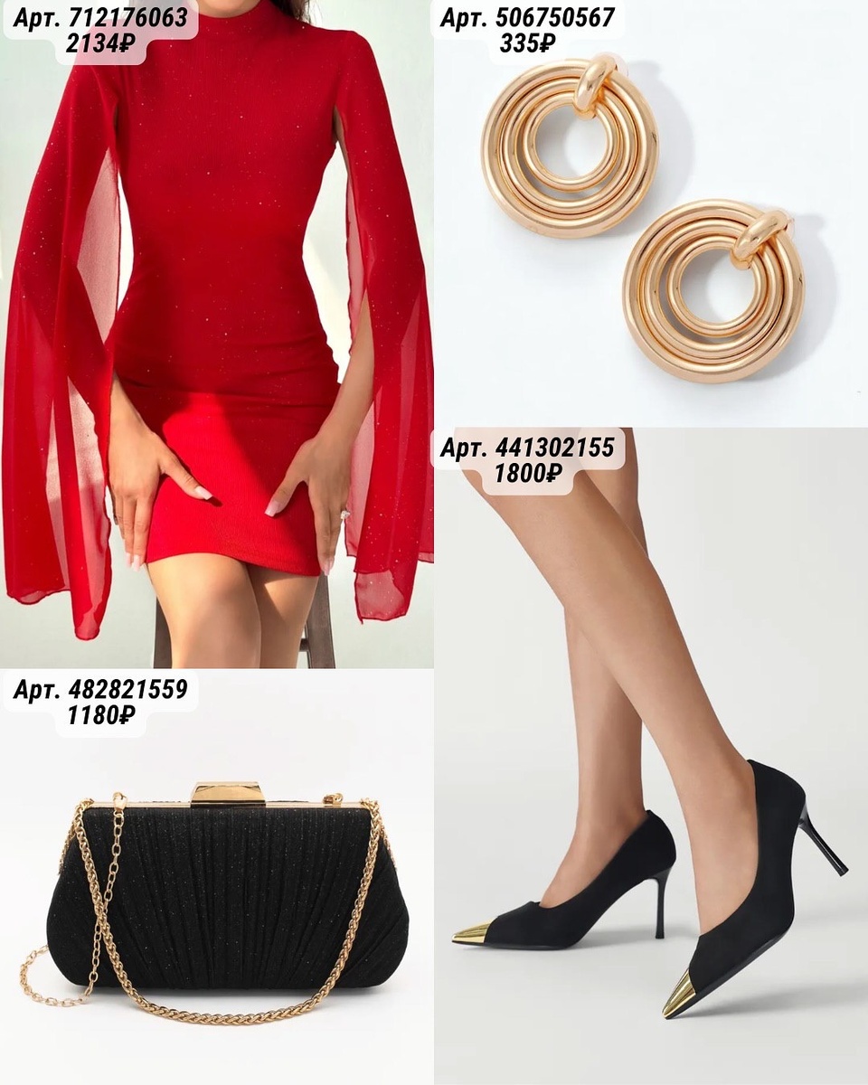 Эта подборка прекрасна тем, что даёт сразу два сценария жизни. Первый — праздничный: красное мини, чёрные туфли с металлом, клатч и серьги делают эффектный выход без лишних усилий. Второй — повседневный: розовый трикотаж, серые джинсы и уютная обувь собирают комфортный городской образ, который выглядит мягко, но дорого.