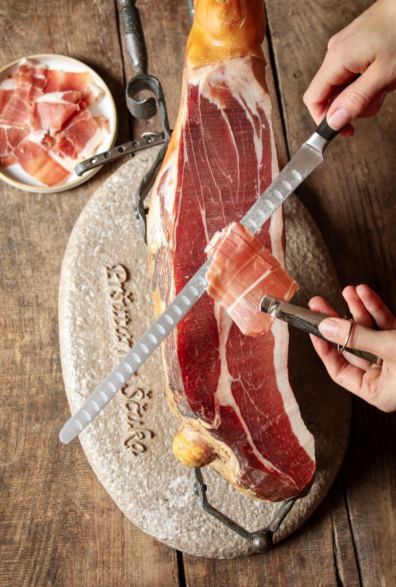 Италия — страна, где даже простое созревание мяса возведено в искусство. И его абсолютный вершиной, эталоном вкуса и традиции, является прошутто. Это не просто ветчина, это — история, терпение и вкус, сконцентрированные в тончайших, тающих слайсах. Когда вы видите на тарелке эти нежно-розовые, почти прозрачные лепестки, вы смотрите на результат кропотливого труда, длящегося от 12 месяцев до нескольких лет. Настоящее прошутто — это свиной окорок, щедро натёртый морской солью, а затем медленно высушенный на горном воздухе в определённых регионах Италии, таких как Парма или Сан-Даниэле. Никакой термической обработки, только соль, воздух, время и мастерство маэстро салайо (мастера по засолке). Первый и ключевой вопрос, который зададут вам в Италии: «Crudo или Cotto?». Это принципиальное разделение. В Sono Italiano мы отдаём дань уважения традициям и используем в наших блюдах именно Прошутто Крудо, чтобы вы могли оценить всю сложность и благородство настоящей сыровяленой ветчины. Да, в Итал