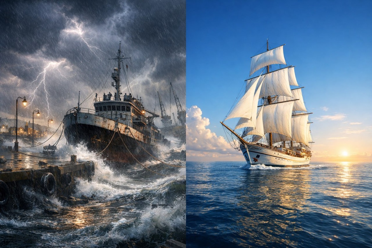 Почему жизнь вроде бы бурлит — а никуда не движется❗️ ➡️ Есть люди, у которых жизнь выглядит как бесконечный шторм. Постоянно что-то происходит: новости, тревоги, обсуждения и много суеты. Кажется, что жизнь кипит. Хотя если присмотреться — чаще всего просто шумит😄 ✅А есть другие. Внешне — спокойно. Без драмы и суеты. И почему-то именно у них жизнь постепенно куда-то приходит😎 Почему так? Попробую объяснить через образ. 📍 Два состояния жизни — как два состояния корабля🛳 Первое. Корабль стоит у причала. Якорь брошен. Начинается шторм — волны бьют, всё трясётся, посуда летает, все бегают и суетятся. Кажется — движуха, экшн, жизнь! Но корабль как стоял, так и стоит. Второе. Корабль вышел в море. Он идёт по курсу. Волны есть, но умеренные. Никто не носится с чашками и не ловит тарелки. Снаружи — даже скучновато. Зато корабль идёт. 📍И вот вопрос: почему у одних жизнь — вечный шторм у причала, а у других — спокойное, но реальное движение? А причина, как обычно, не там, где при