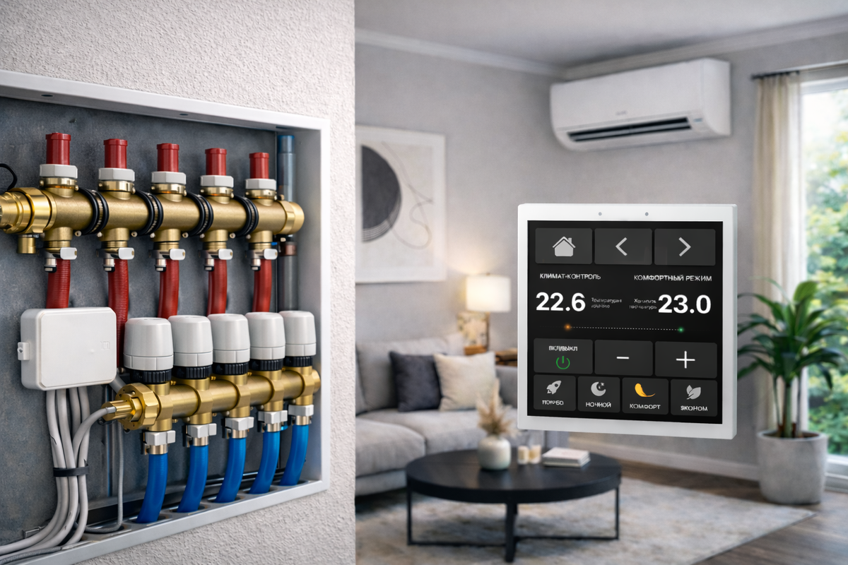 Когда говорят «климат в доме», многие до сих пор представляют себе тёплые полы отдельно, радиаторы отдельно и кондиционеры, которые живут своей жизнью с пультом где-то в ящике. На практике комфорт появляется только тогда, когда все эти системы работают как одно целое. Особенно остро проблема проявляется в переходные периоды — осенью и весной. Именно в это время владельцы домов чаще всего сталкиваются с ощущением, что автоматизация вроде бы есть, а удобства и стабильности нет. Разберёмся, почему так происходит и как эта задача решается правильно. В межсезонье часто возникает типовая ситуация.