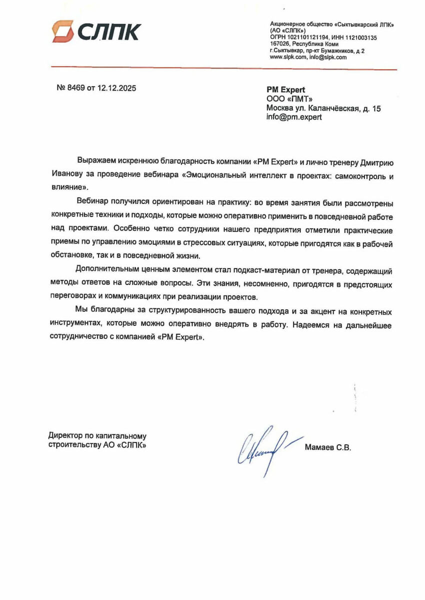 Делимся обратной связью от АО "Сыктывкарский ЛПК" - корпоративный клиент оценил вебинар «Эмоциональный интеллект в проектах: самоконтроль и влияние». Слушатели отметили прикладной формат - конкретные техники, которые можно быстро внедрить в работу. Отдельно выделили инструменты, которые помогают не "вскипать" под давлением, и понятные схемы ответов на сложные вопросы в деловых диалогах. Сегодня в проектах всё чаще становится очевидно: результат зависит не только от процессов и экспертизы, но и от того, как команда и лидер управляют эмоциями и взаимодействием в сложных ситуациях. ✨ Осознавая эту потребность, мы запустили две новые практические мастерские: "Эмоциональный интеллект лидера проекта" "Эмоциональный интеллект команды проекта: самоорганизация и взаимовыручка". 🔜 Скоро расскажем о мастерских подробнее - как устроен формат, какие задачи они помогают решать, и кому они будут особенно полезны. #PMExpert #управлениепроектами #корпоративноеобучение #эмоциональныйинтеллект #соф