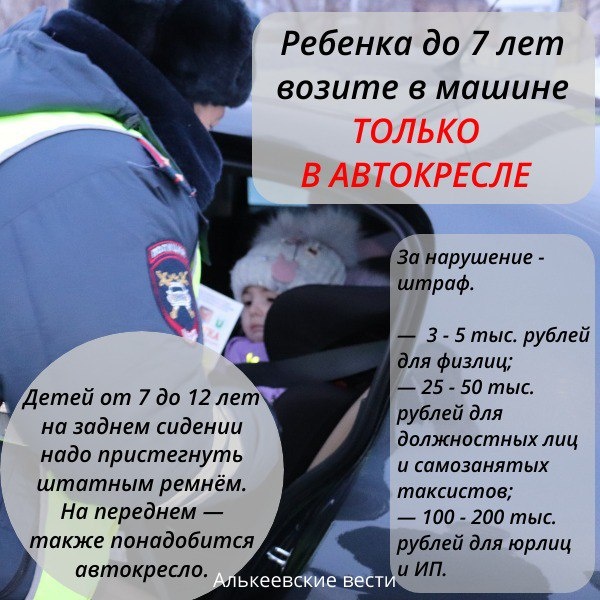 Детей от 7 до 12 лет на заднем сидении можно пристегнуть штатным ремнём. Но если они поедут на переднем — также понадобится автокресло. Это прописано в ПДД, и за нарушение грозит штраф. С 9 января его размеры выросли: — с 3 тыс. до 5 тыс. рублей для физлиц; — с 25 тыс. до 50 тыс. рублей для должностных лиц и самозанятых таксистов; — с 100 тыс. до 200 тыс. рублей для юрлиц и ИП. перпиши для сайта | 📰Новости Алькеевского района📸 MAX-канал - подпишитесь. Вконтакте - подпишитесь. Сайт - посмотреть.