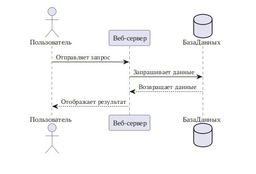 [plantuml, sequence_diagram_example, svg] .... @startuml actor Пользователь participant "Веб-сервер" as WS database БазаДанных Пользователь -> WS: Отправляет запрос WS -> БазаДанных: Запрашивает данн