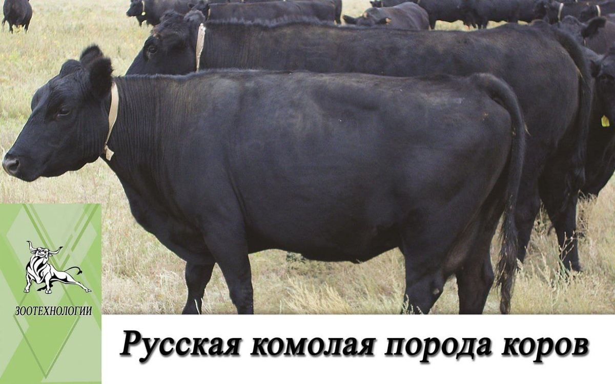 📖 Русская комолая (Russian hornless) порода выведена относительно недавно, при скрещивании Калмыцких коров с Абердин-ангусскими быками с последующим жестким отбором и разведением помесей в себе. Работа над ее выведением шла более 50 лет. Включена в Госреестр в 2007 г. На данный момент насчитывается около 8 тысяч особей этой породы. Получили высокое распространение в регионах РФ. 🐄 Параметры тела: Тело гармонично сложено, крупное, мускулистое, корпус прямоугольной формы. Их голова средней длины, профиль прямой. У коров лоб низкий, у быков средней ширины. Затылочный гребень выпуклый. Носовое зеркало черное. У быков имеется горб, у коров шея прямая. Спина прямая, круп мощный. Имеют короткие конечности. Туловище средней длины. Кожа тонкая. Как следует из названия все животные этой породы комолые. Масть всегда черная. 🍀 Продуктивность: Мясо русского комолого скота нежное, ценится за мраморность, диетические и вкусовые качества, обладает биологической полноценностью. Готовы к забою в 1