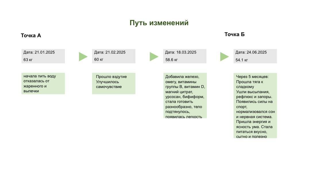 Иногда изменения начинаются не с желания «похудеть» или «наладить питание». А с тихого ощущения, что ты больше не узнаёшь себя — ни в зеркале, ни по самочувствию. С этого момента и началась история нашей студентки ✨ 🔸В точке А было +6 кг, постоянное чувство дискомфорта и чуждости собственному телу. Утром — сильная усталость и апатия, будто ночь вообще не давала восстановления. На лице появились высыпания, которых не было даже в подростковом возрасте. Пищеварение подводило: сильные запоры и рефлюкс, с которыми не справлялись даже лекарства, назначенные врачом. Сон был поверхностным и не восстанавливающим 😴 Работа началась с диагностики, а не с догадок 🧪 Были сданы анализы крови, ферритин, витамины группы B, биохимия, гормоны щитовидной железы. Проведены абдоминальное УЗИ и ФГДС, где выявили перегиб желчного пузыря и рефлюкс-эзофагит. ✅По результатам выстроили поддержку дефицитов: железо, витамины группы B, пробиотик. Питание постепенно перестроили — белок появился в каждом приёме