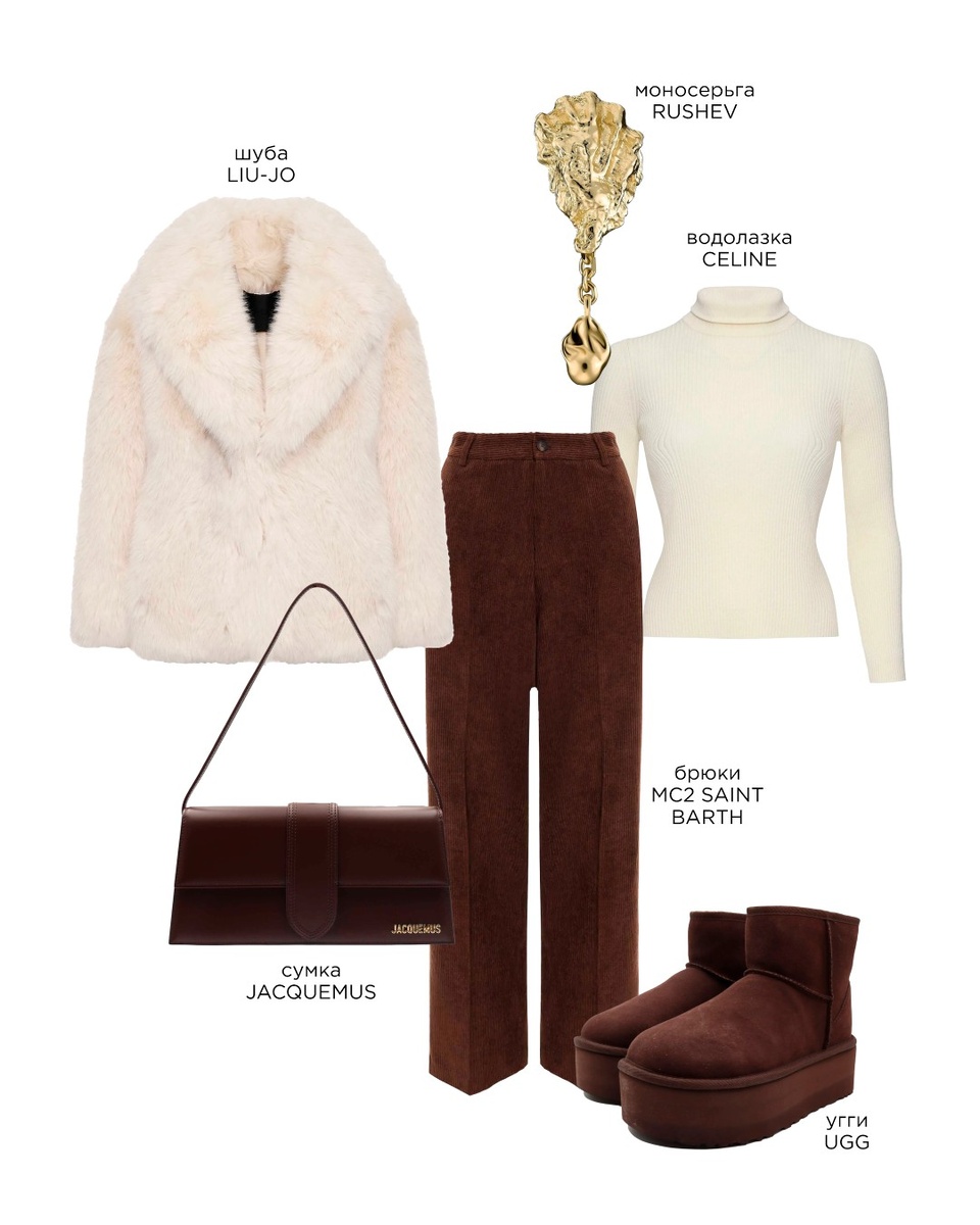 Когда за окном −15 °C, стиль начинает мериться не только красотой силуэта, но и способностью сохранять тепло без визуального компромисса. Этой зимой мода подтверждает, что тепло и элегантность не только совместимы, но и усиливают друг друга. 🔹 Главная роль — верхней одежде В холодную погоду пальто, шуба или функциональная куртка — это основа стильного образа. В этом сезоне особое внимание отведено эко-меху в стиле old-money, который сочетает визуальную роскошь с этической осознанностью. Помимо меха, возвращаются объемные cocoon-силуэты и шерстяные кейпы — они согревают и дают архитектонику образу. Шуба, водолазка, брюки, угги, сумка, моносерьга 🔹 Палитра зимы Самым выгодным фоном для холода служат богатые, глубокие оттенки: тёмно-шоколадный, охра, кэмел, индиго и приглушённые природные тона. Такая палитра даёт ощущение тепла уже на уровне восприятия цвета и работает на элегантный визуальный баланс. Пуховик, водолазка, джинсы, п/сапоги, сумка, серьги 🔹 Функциональные слои Тепло дости