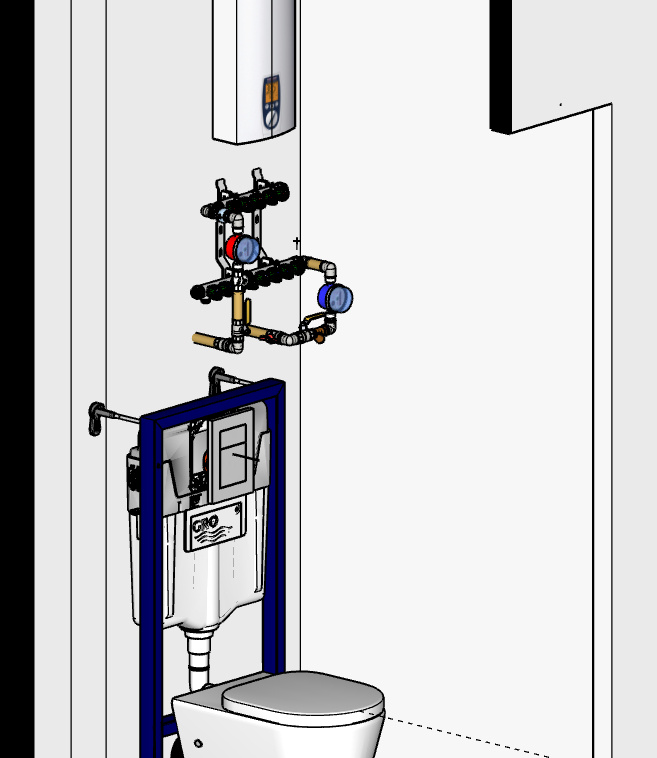 Понемногу занимаюсь проектом будущего ремонта, сегодня дошёл до узла ввода водоснабжения и его компоновки в крошечном пространстве. Изнчачально выводы труб из стены находятся на высоте ~905мм от пола, перенесу на 350мм вверх. В доме этом я родился, вопросов к качеству и давлению воды никогда не возникало, вкусная, мягкая и чистая, кран-буксы живут подолгу, поэтому от фильтров и редукторов отказался (давление на входе 3.5 - 4). Разводка от коллекторов пойдёт сшитым полиэтиленом до точек водоразбора, проточный водогрей в этом варианте подключится гибкими подводками прямо от коллекторов. Жёлтые рычажные краны - для моторов системы защиты от протечек, устанавливающихся накладным способом. При такой компоновке у левой стены ещё останется место для полок хранения, есть где разместить розетку для моторов СЗП, а глубина ниши от стены до поверхности чистового покрытия всего 33см. Возможно получится выгадать ещё пару см, развернув краны СЗП на 90 градусов по оси труб, но это не точно) Засада ещё