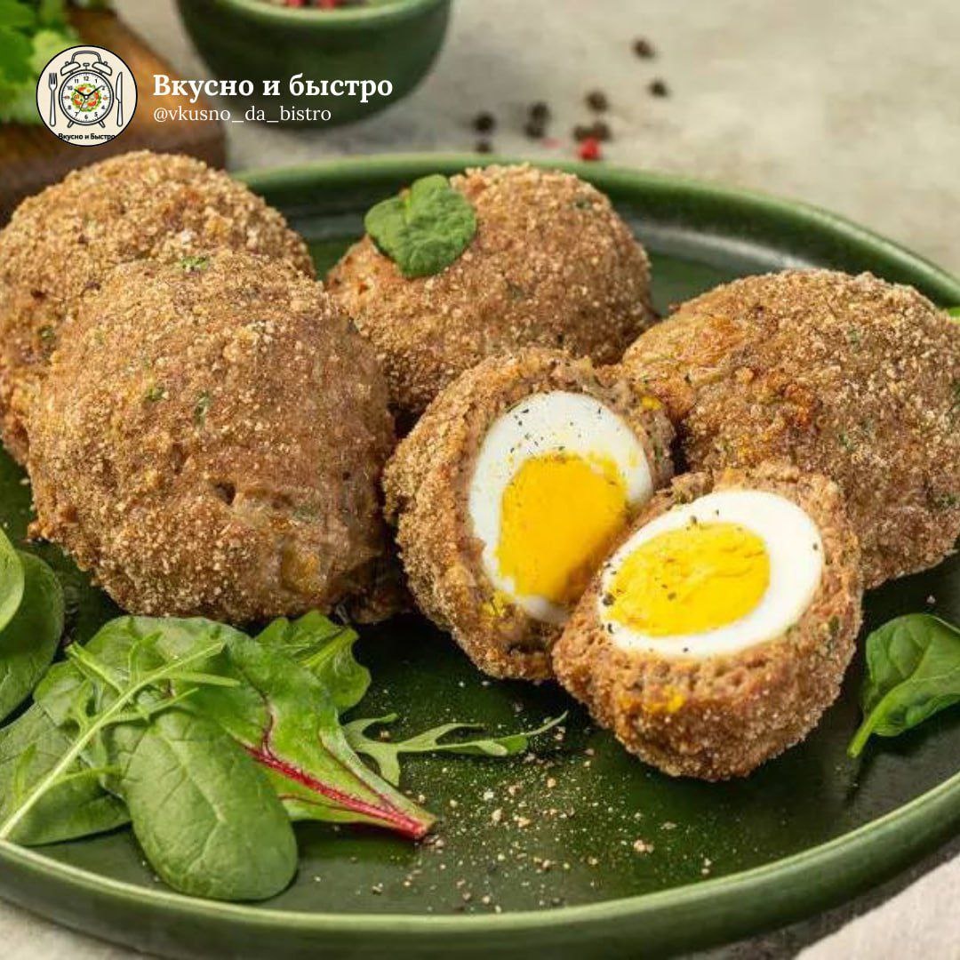 #обед #40мин 🕒Время приготовления: ~40 минут Порции: 6–7 шт. Сложность: средняя 🧾 Ингредиенты: 🟠Говяжий фарш — 400 г 🟠Вустерский соус — 1 ст. л. 🟠Горчица — 1 ст. л. 🟠Соль — 0,5 ч. л. 🟠Сушёный чеснок — 0,5 ч. л. 🟠Смесь перцев — 0,5 ч. л. 🟠Паприка — 0,5 ч. л. 🟠Яйца (отварные) — 7 шт. Для панировки: 🟠Мука — 100 г 🟠Яйца — 2 шт. 🟠Панировочные сухари — 150 г 🟠Подсолнечное масло — для жарки 🍴Приготовление: 1. Яйца отварите всмятку (6 минут) и очистите. 2. Смешайте фарш с соусом, горчицей, солью, чесноком, перцами и паприкой. 3. Яйца обваляйте в муке — так фарш лучше прилипнет. 4. Оберните яйца фаршем, сформируйте аккуратные шарики. 5. Панируйте: мука → взбитые яйца → сухари. 6. Жарьте на среднем огне до золотистой корочки, чтобы фарш полностью прожарился. Вкусно и Быстро | Мы в Мах 📲
