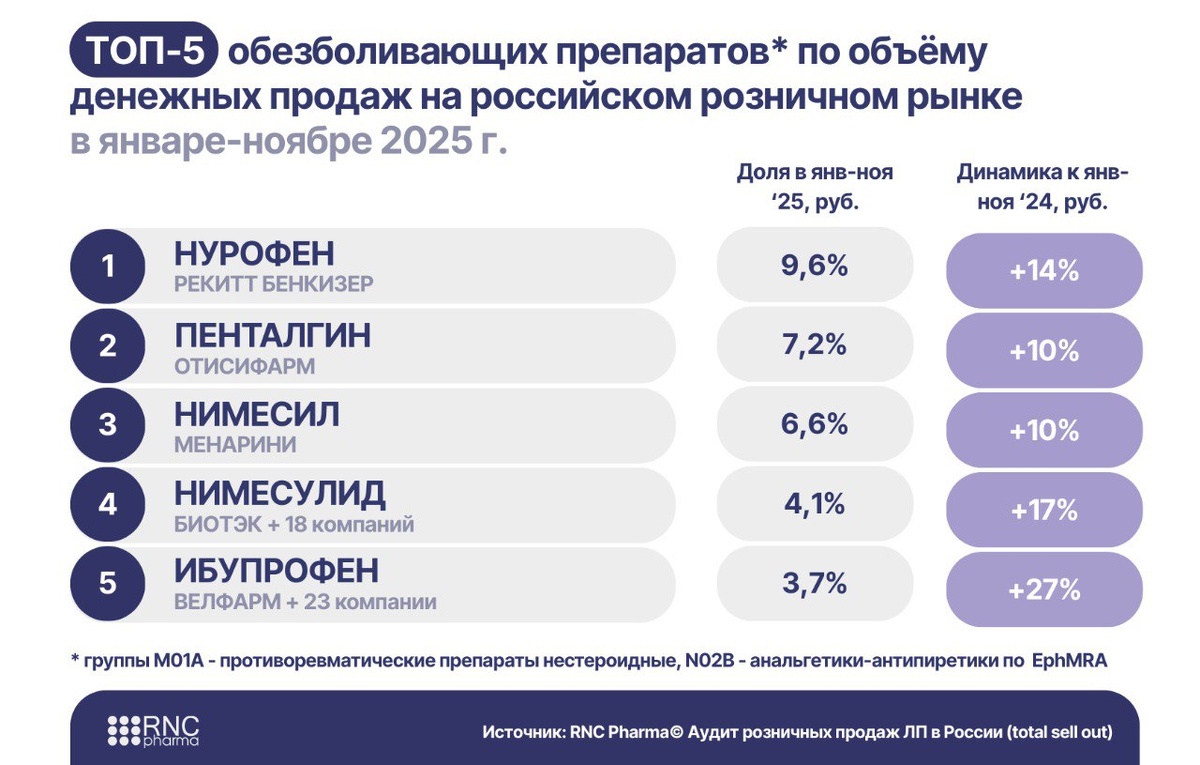 Π°Π½Π°Π»ΡΠ³Π΅ΡΠΈΠΊΠΎΠ² (M01A ΠΈ N02B ΠΏΠΎ EphMRA) Π½Π° ΡΠΎΡΡΠΈΠΉΡΠΊΠΎΠΌ ΡΠΎΠ·Π½ΠΈΡΠ½ΠΎΠΌ ΡΡΠ½ΠΊΠ΅ (+12,4% ΠΊ ΡΠ½Π²-Π½ΠΎΡ β24) π 524,2 ΠΌΠ»Π½ ΡΠΏΠ°ΠΊΠΎΠ²ΠΎΠΊ Π±ΡΠ»ΠΎ ΡΠ΅Π°Π»ΠΈΠ·ΠΎΠ²Π°Π½ΠΎ (+2,1% ΠΊ ΡΠ½Π²-Π½ΠΎΡ β24) π 240 ΡΠΎΡΠ³ΠΎΠ²ΡΡ
