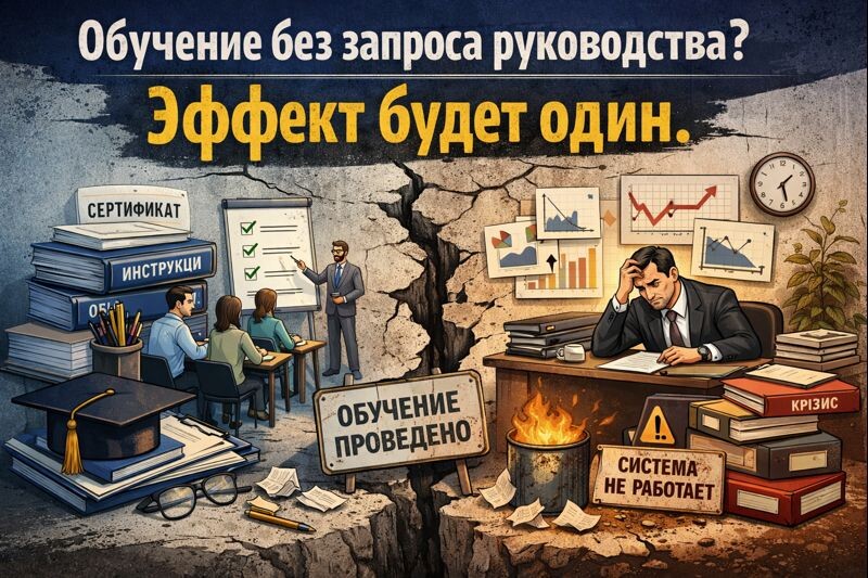 Отчёты закрывают. А управляемость — не появляется. И почти всегда причина одна и та же: обучение запускают без управленческого запроса сверху. Чаще всего инициатор обучения — не руководство, а «функции»: Формулировка запроса звучит разумно: «Нужно обучить людей, чтобы система заработала». Но если задать руководству простые вопросы, ответы отсутствуют: В результате обучение существует само по себе, отдельно от управления. Сценарий повторяется из проекта в проект: 👉 Решение — обучение. Дальше — стандартный выбор: И запуск без управленческой рамки. В этот момент обучение начинают воспринимать как самостоятельное решение,