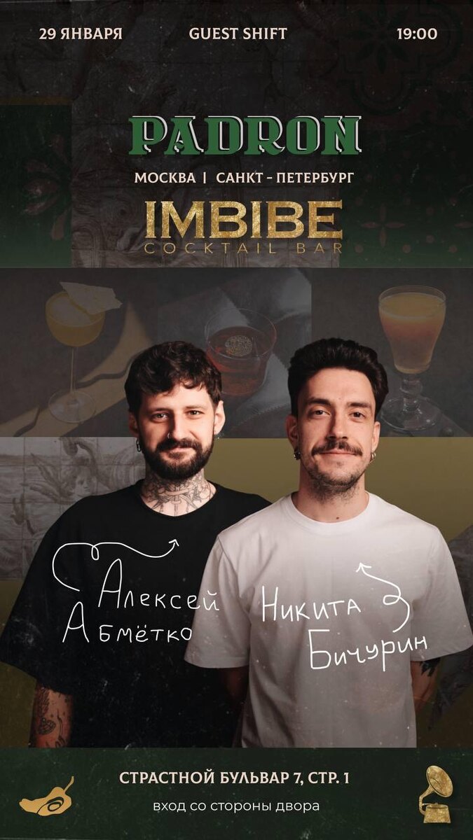 🩶 В четверг, 29 января, с 19:00 в Padron – легендарный петербургский бар Imbibe. За барной стойкой в столице – бар-менеджер Никита Бичурин и бартендер Алексей Абмётко. Padron Bar продолжает принимать у себя лучшие заграничные и российские бары. В конце января в Москву приедет Imbibe – проект команды Imbibe Crew, влюбленных в коктейльное ремесло профессионалов, нацеленных на создание качественного продукта и развитие барной культуры города. Imbibe Cocktail Bar – городской символ, бар, поставивший в один ряд слова «коктейль» и «Санкт-Петербург». Более 10 лет команда является важным ориентиром для любителей смешанных напитков и амбассадорами фирменного рок-н-рольного гостеприимства. 29 января петербуржцы представят гостям Padron 4 спешл-коктейля, подготовленных специально для Padron, c яркой испано-португальской основой: Spanish Breakfast – цитрусово-пряный твист на Breakfast мартини, Hot Sherry Punch – сливочно-плотный согревающий напиток на основе хересного бренди и капли педро