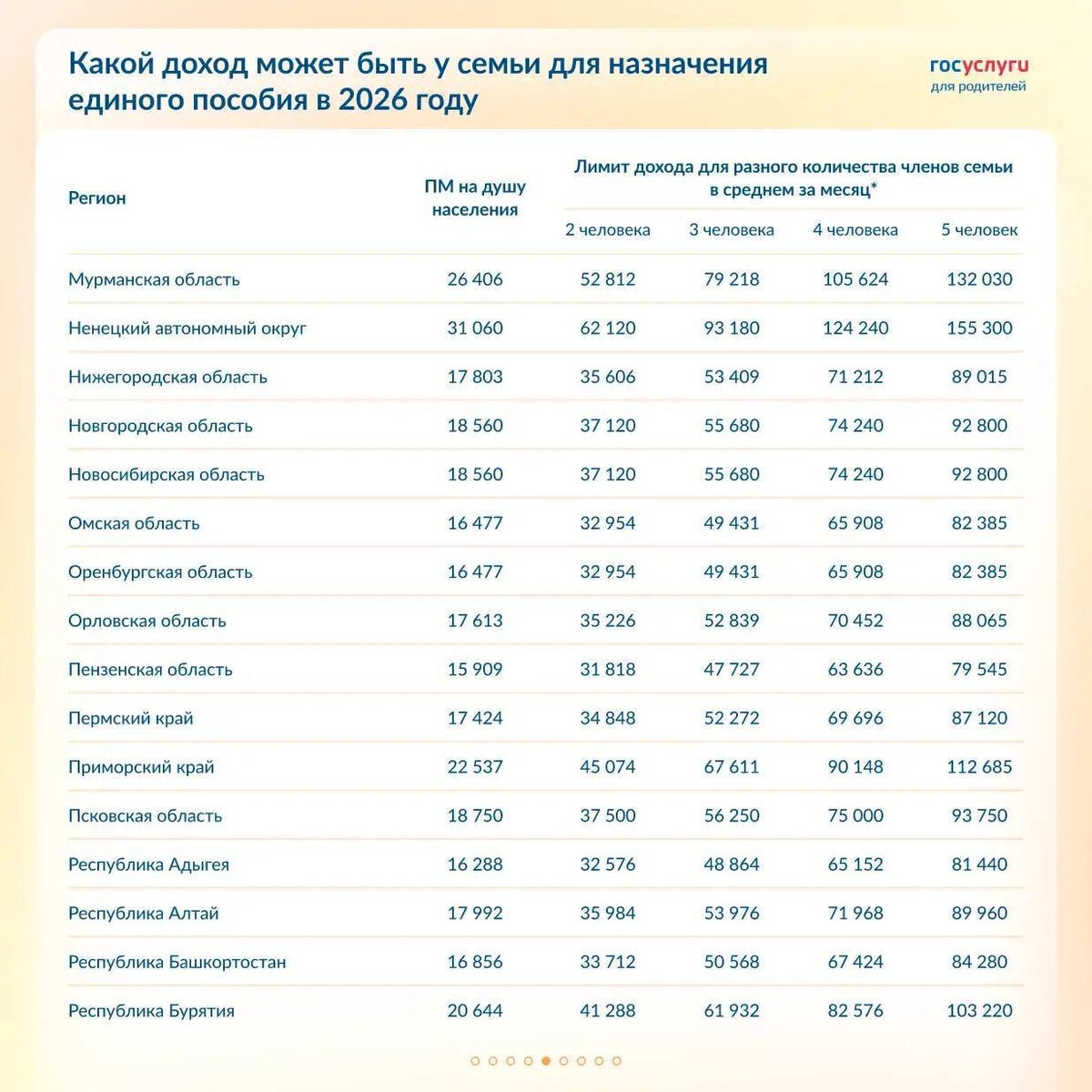В таблице — прожиточный минимум на 2026 год. И расчет максимально возможного дохода в месяц для семей из 2, 3, 4 и 5 человек. Это условная величина для простоты оценки. Подойдет семьям с фиксированным доходом, например только с зарплатой. ❗️Но не забываем, что кроме зарплаты и ежемесячного дохода учитываются и другие поступления. Если вам нужна консультация по правильному расчету вашего дохода, верному месяцу подачи заявления для прохождения на более высокий процент, то ждём вас на платной консультации 👉🏻 Помним, что если вам одобрили 50%, то получить 75 или 100 уже не получится. Поэтому готовьтесь к подаче правильно и заранее👌🏻