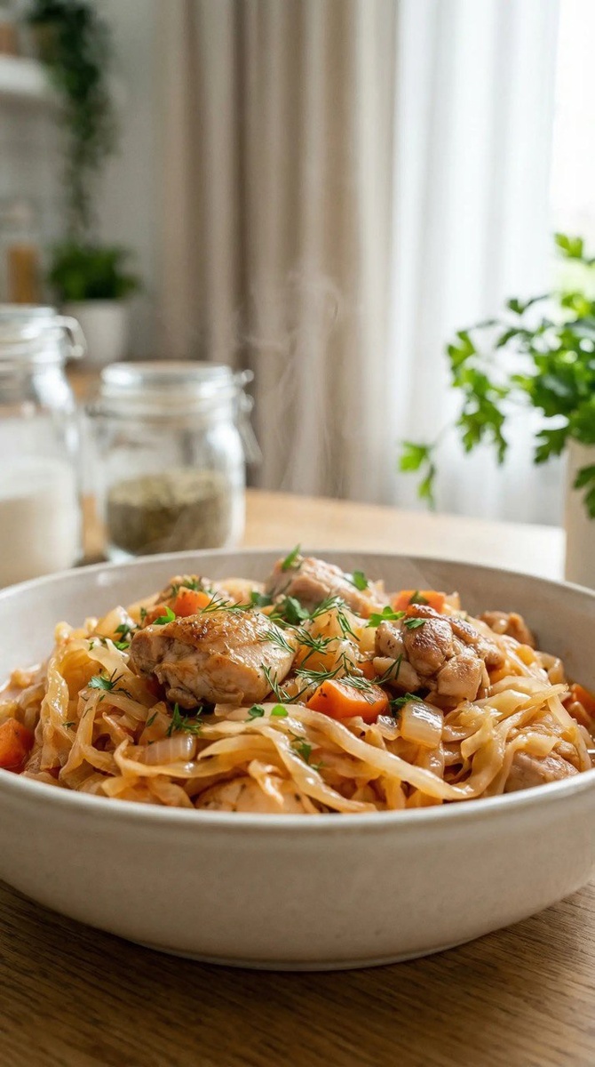 3. К курице выкладываем шинкованную капусту, томатную пасту, соль, специи, заливаем водой.