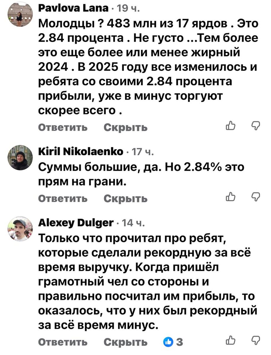 Выручка у них 17 млрд, чистая прибыль 400 млн. И читаю комментарии, как на картинке . Бл*ть, да кто такое пишет даже близко ничего не сделали, а сидят осуждают мол 2.8% прибыли - маловато… Мда... Как думаете, 400 млн. руб. за 2024 год чистой (!) прибыли (бухгалтерская) - это мало? Это не выручка, а прибыль. После уплаты налогов и т.п. Слов нет, как у нас любят обесценивать чужой успех, т.к. зависть просто выгрызает остатки мозга :) Русский ИТ бизнес