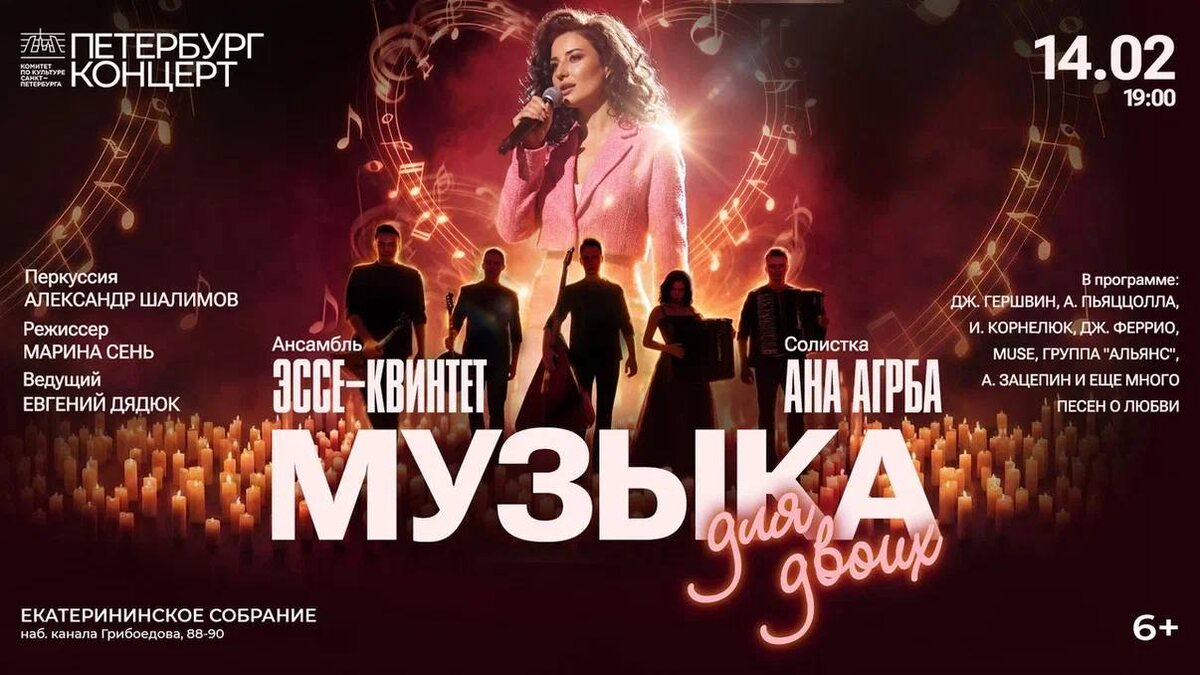 конкурсов ансамбль национальных инструментов «Эссе-Квинтет», блистательная вокалистка Ана Агрба и перкуссионист-виртуоз Александр Шалимов исполнят вокальные и инструментальные хиты, где каждая нота — признание, а каждая мелодия — история любви. В изысканную программу вошли «Либертанго», «Тангедия» и «Весна в Буэнос-Айресе» Астора Пьяццоллы, Summertime Джорджа Гершвина, Fly Me to the Moon Барта Говарда, Parole, parole Джанни Феррио, «На заре» из репертуара группы «Альянс», Muse — Эссе-Квинтет — Resistance, «Город, которого нет» Игоря Корнелюка и другие песни о любви. Билеты по ссылке: vk.cc/cTMI7t