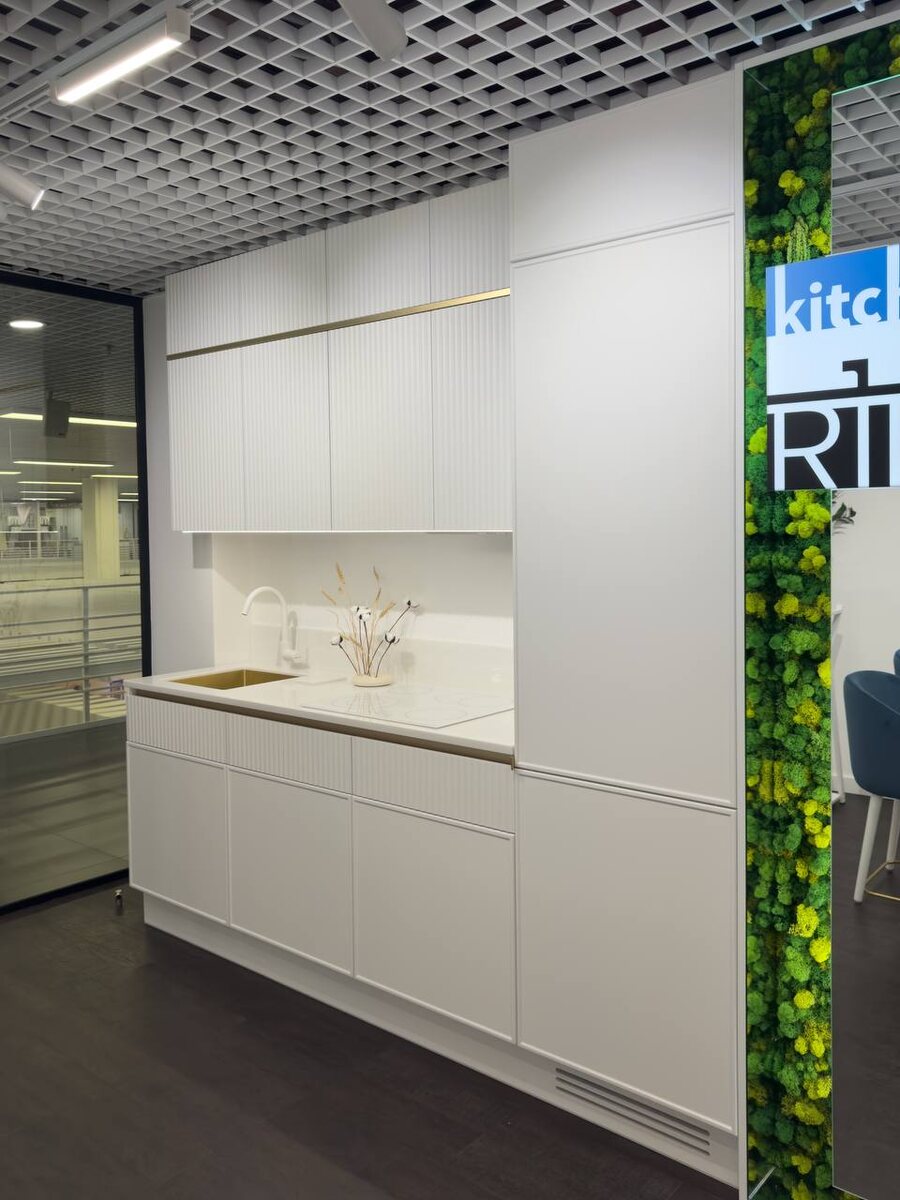 Когда мы создавали эту кухню для шоурума, мы спорили. «Белый — это скучно», — повторяли некоторые. Мы же хотели доказать обратное: что белый цвет может быть самым сложным и самым эмоциональным выбором. Что он способен не просто «не мешать», а становиться главным героем. Перед вами не макет. Это манифест. Манифест того, как абсолютная чистота линий встречается с тактильной роскошью деталей. Золотые акценты здесь — не украшение. Это пунктир, который ведет взгляд. Встроенный свет — не просто освещение. Это сценарий: утренний — яркий и бодрый, вечерний — мягкий и камерный. Но главное — то, что не видно с первого взгляда. Умные системы, которые открываются одним касанием. Кофемашина, которая становится частью композиции, а не гаджетом на столешнице. Петли, которые помнят, как вам удобно. Даже мусорное ведро здесь — часть системы, а не необходимое зло. Эта кухня существует, чтобы нарушать правила. Чтобы доказывать, что «идеально белое» — это не про пустоту, а про наполненность смыслом и т