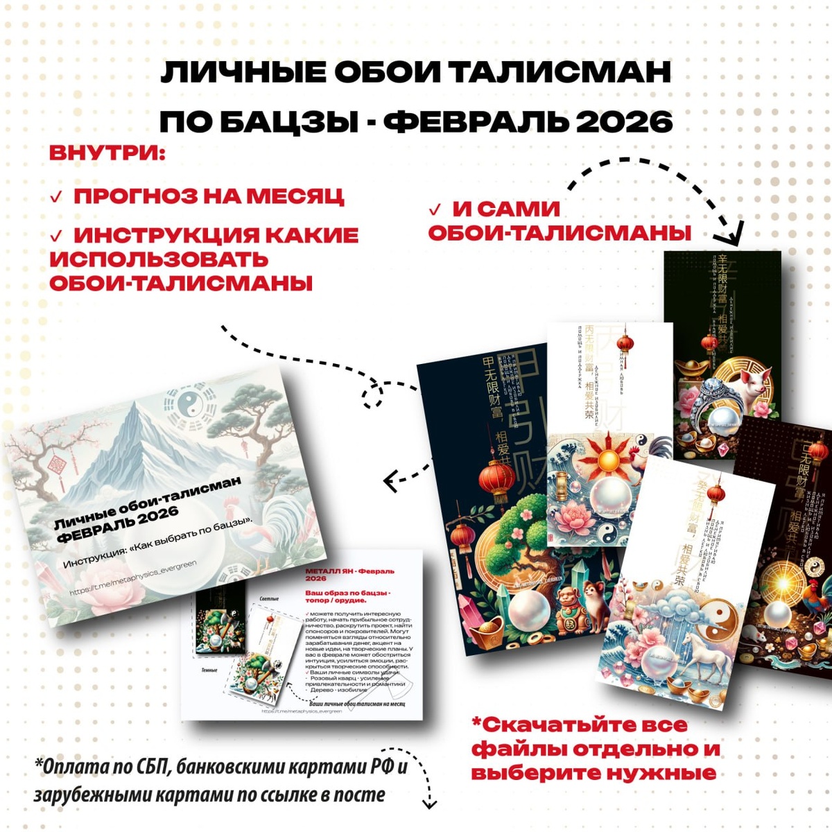 🐯 Дорогие мои, как всегда для вашей большей поддержки личные обои талисманы по Бацзы 🙏 ✔️ В этом месяце - Жемчужина! 🙏 Обои созданы для вашей карты БаЦзы - чтобы поддержать ваш личный путь и усилить удачу в месяце Тигра. И внутри ключевой прогноз для вас! 🧭 Подойдут даже новичкам - внутри будет подробная и понятная инструкция. 💰 Стоимость символическая: 490 рублей до 7-го февраля, далее 890 рублей Есть поддержка оплаты зарубежными картами 🤍 По ссылке 👇 https://taplink.cc/maria_evergreen/p/talismanbazifeb26/ Если не получается скачать, пишите мне @maria_evergreen ✨ Общие заряженные обои я выложу, как всегда, в день начала месяца Тигра, чтобы каждый мог прикоснуться к потоку мудрости и света. Возьмите свою удачу на новый месяц! ❤️🙏