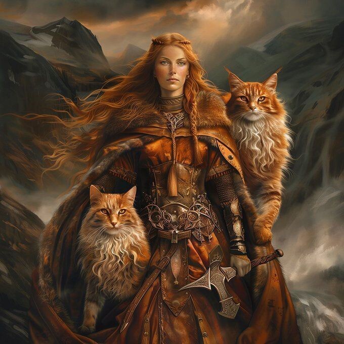 Богиня Фрейя, покровительница любви и красоты в скандинавской мифологии, известна не только своей грацией и могуществом, но и необычными спутниками — двумя огромными кошками. Эти кошки, по преданию, были подарены ей богом Тором, и Фрейя использовала их для передвижения, запрягая в свою колесницу.