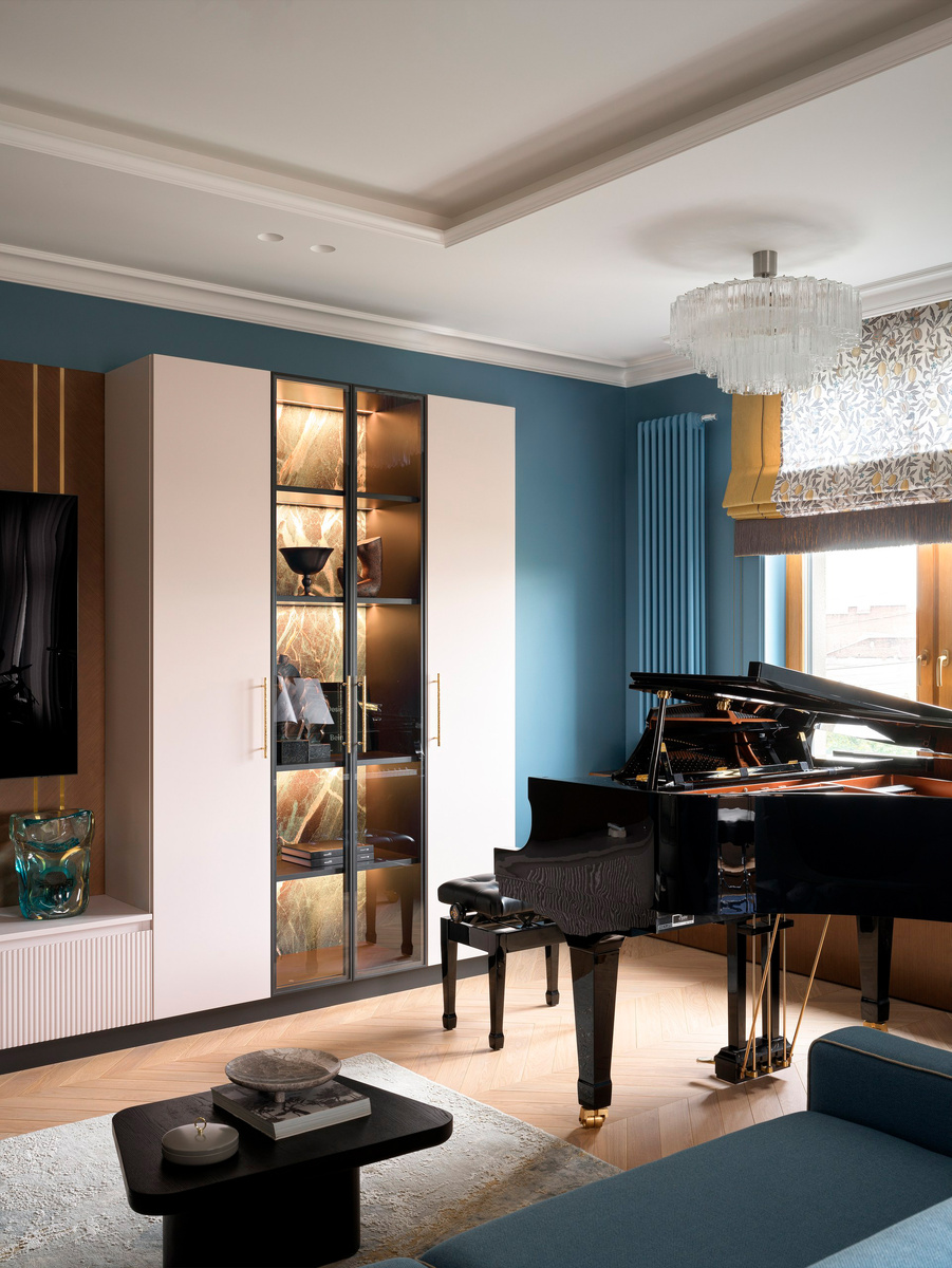 Архитекторы Леон Ксения и Александра Черногор создали функциональное пространство, наполненное светом и воздухом. Интерьер разработан в эклектичном стиле, где переплетаются детали из разных культур. Авторы переосмыслили планировочное решение, увеличив гостиную, чтобы создать там настоящую музыкальную «лабораторию», где нашлось место роялю, барабанам и даже арфе. Эта квартира в центре Петербурга — не просто жилье, а настоящая галерея путешествий и музыкального вдохновения. Каждый уголок здесь наполнен жизнью и историей, что делает ее идеальным местом для настоящих путешественников. Прихожая со своей гардеробной была организована таким образом, чтобы было и функциональное, и визуальное деление «грязной» и чистой зоны. Вся квартира разделена на 2 зоны: приватную (спальня, детские, кабинет, ванные) и гостевую (кухня, гостиная, гостевой санузел, спортивная комната). В мастер-спальне, помимо вмести тельного шкафа, организовали отдельную гардеробную. Примечательны ванные комнаты, каждая из