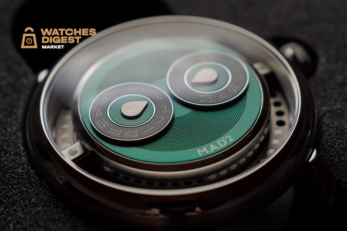 MB&F M.A.D 2 Green Edition — продолжение концепции MAD (Mechanical Art Devices), в которой Max Büsser & Friends предлагают взглянуть на часы вне привычных канонов. Вероятно, многие помнят, что версия 2025 года — творение талантливого дизайнера Эрика Жиру и оммаж его приключениям молодости 😊 Но давайте притворимся, что этого не слышали, и посмотрим на эту модель с зелёным циферблатом просто как на интереснейший часовой эксперимент с индустриальным дизайном. Дизайн и материалы Корпус диаметром 42 мм и толщиной 12,3 мм выполнен из нержавеющей стали. Форма подчёркнуто геометрична, с чёткими линиями и массивным присутствием на запястье. Стальной безель визуально усиливает ощущение цельности и добавляет корпусу архитектурной строгости. Зелёный циферблат — ключевой визуальный элемент модели. Его оттенок глубокий и насыщенный, меняющийся в зависимости от освещения. Компоновка полностью лишена традиционных стрелок: индикация времени вынесена в отдельные окна и шкалы, что создаёт эффект «меха