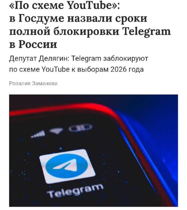 » Зампред комитета Госдумы Михаил Делягин назвал дедлайн полной блокировки мессенджера в РФ — выборы в сентябре 2026 года. 🥶 Методика «удушения» Это означает постепенную деградацию сервиса (замедление, сбои загрузки), пока им не станет невозможно пользоваться без VPN. Так же блокировали YouTube. 😡 Признаки блокировки В середине января пользователи уже сталкивались с массовыми сбоями при загрузке видео. Тогда в Госдуме это назвали «намеком» Павлу Дурову, хотя Роскомнадзор официально отрицал свою причастность. Важный нюанс: это прогноз одного депутата. Ранее в Администрации Президента заявляли, что угрозы блокировки для Telegram нет. Правда, про YouTube говорили так же. Готовы к переезду в «Мах»? 🤡 — уже там 😁 — они ничего не заблокируют 👀 — будем жить с VPN
