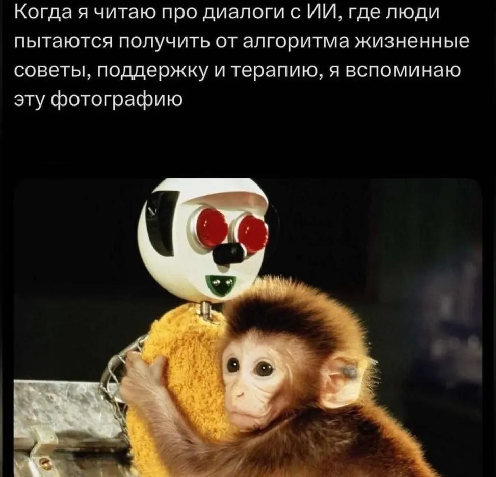 кормящая? Он показал, что важна не только функциональная забота, а и эмоциональная Ласка и привязанность также необходимы для выживания, как и еда/сон и прочие витальные потребности Поэтому ИИ хороший помощник, но никак не заменитель живого человеческого контакта #мемымоимемы #отношения
