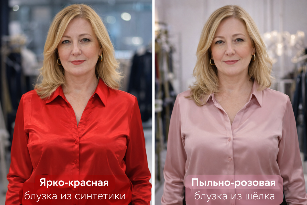 Вы можете наблюдать этот эффект, если сравните два образа: ярко-красная блузка из синтетики и пыльно-розовая блузка из шёлка. Второй вариант выглядит интереснее и дороже, хотя цвет приглушённый.