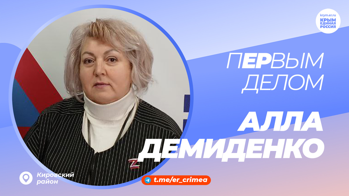 Благоустройство территории поселения, организация патриотических мероприятий и поддержка общественных инициатив жителей - важные направления работы секретаря первичного отделения. Новой героиней рубрики «пЕРвым делом», в которой мы рассказываем о руководителях партийных ячеек Единой России в регионах Крыма, стала Алла Демиденко - секретарь первичного отделения №786 в селе Синицыно Кировского района. Общественную деятельность в партии она начала в 2014 году. Помимо первичного отделения, Алла Демиденко возглавляет ГБУ РК «Центр социального обслуживания граждан пожилого возраста и инвалидов Кировского района», а также является депутатом Кировского районного совета. Она всегда готова выслушать проблемы односельчан и старается каждому оказать посильную помощь. «Задача секретаря первичного отделения – быть ближе к людям, знать все о проблемах и помогать в их решении. Первичные отделения - это надежный фундамент партийной организации, способствующий ее активной и результативной деятельности.