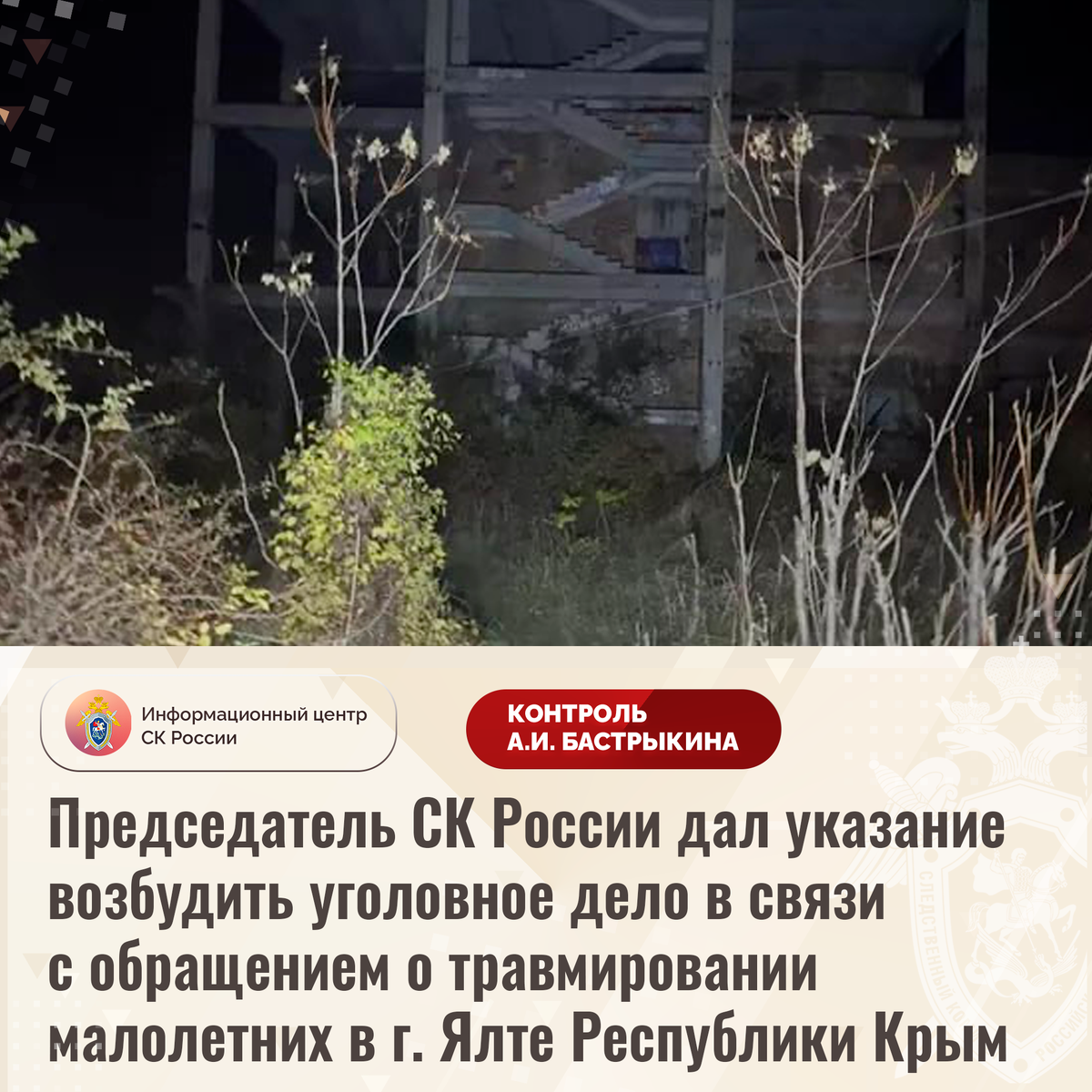 Председатель СК России дал указание возбудить уголовное дело в связи с обращением о травмировании малолетних в г. Ялте Республики Крым В Информационный центр СК России обратился житель Республики Крым по вопросу несогласия с ходом установления обстоятельств травмирования детей при падении с недостроенного здания в городе Ялте. На протяжении нескольких лет объект незавершённого строительства на улице Мухина надлежащим образом не огорожен, граждане имеют свободный доступ на территорию небезопасного сооружения, ввиду чего оно является местом сбора подростков. В сентябре 2021 года 13-летний мальчик упал с 3 этажа, получив телесные повреждения. В октябре прошлого года в результате падения 14-летнего сына заявителя с 4 этажа недостроя его здоровью причинен вред. Обоим подросткам установлена инвалидность. Несмотря на имеющиеся нарушения, никто к ответственности не привлечен. В ГСУ СК России по Республике Крым и городу Севастополю по факту травмирования первого мальчика проводилась процессуаль