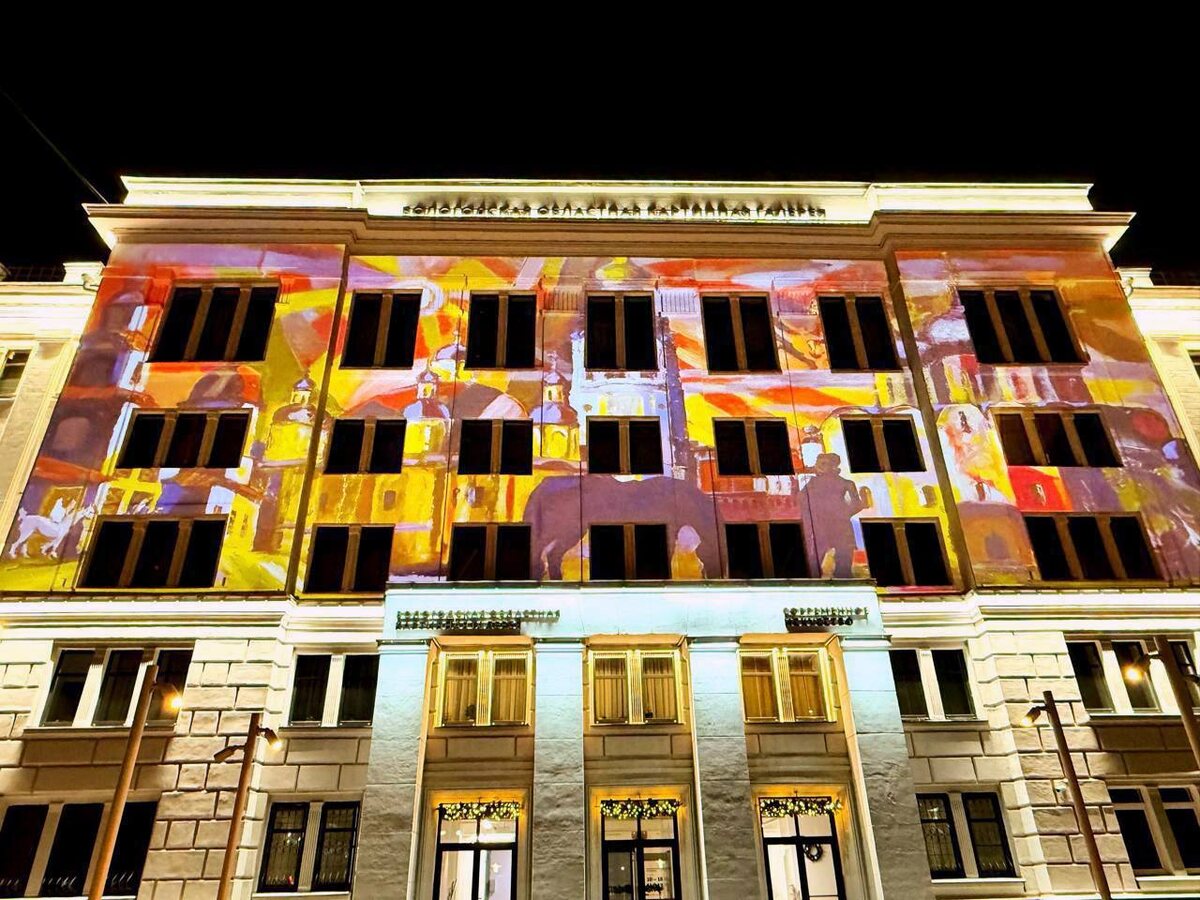 Художественный музей располагается в центре города по адресу: ул. Мира, 34 и имеет историческое значение для всей области, так как насчитывает 44 тысячи единиц хранения экземпляров разных периодов. Освещение фасада выполнено с использованием 657 линейных и точечных светильников, которые позволяют выделить фактуру и архитектурные элементы здания. Цветовая температура представлена в виде нейтральных и теплых оттенков Ключевым элементом проекта стала технология слайд-мэппинга. С её помощью на центральную часть фасада проецируется изображение картины вологодского художника-фронтовика Владимира Корбакова «Поэт Константин Батюшков гуляет по Вологде». Секрет данного приема заключается во внедрении в каждый проектор идеально выверенных по размерам стеклянных "слайдов", совокупность которых создает полноценное изображение, подходящее под любую архитектурную форму объекта. usupov.pro