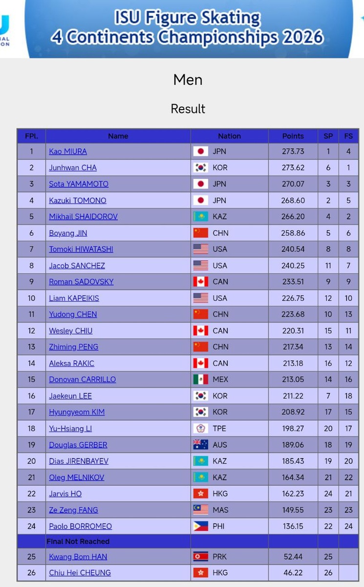 Исполнил программу с двумя четверными тулупами, один в каскаде с тройным. Было два тройных акселя, один - через ойлер с двойным сальховом. Секвенция из тройного лутца с двойным акселем. Приземлил все прыжки и остался доволен собой. Оценка - 175,39 (270.07) балла - стабильно третий на этом турнире. Для Соты - это первая большая награда.