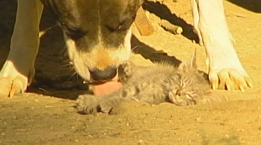 Кошка Атлантида, найденная питбулем Фросей, переняла охранные повадки спасителя