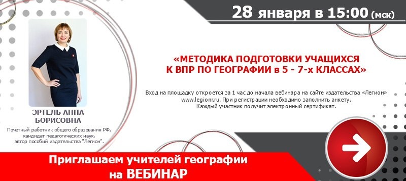 " Дата: 28.01.2026 (Ср) Время: 15:00 Эртель Анна Борисовна - почетный работник общего образования РФ, кандидат педагогических наук, доцент кафедры социально-экономической географии и природопользования Института наук о Земле Южного федерального университета, автор пособий издательства "Легион" по географии. Участие бесплатное. Выдается сертификат. Требуется регистрация на сайте издательства