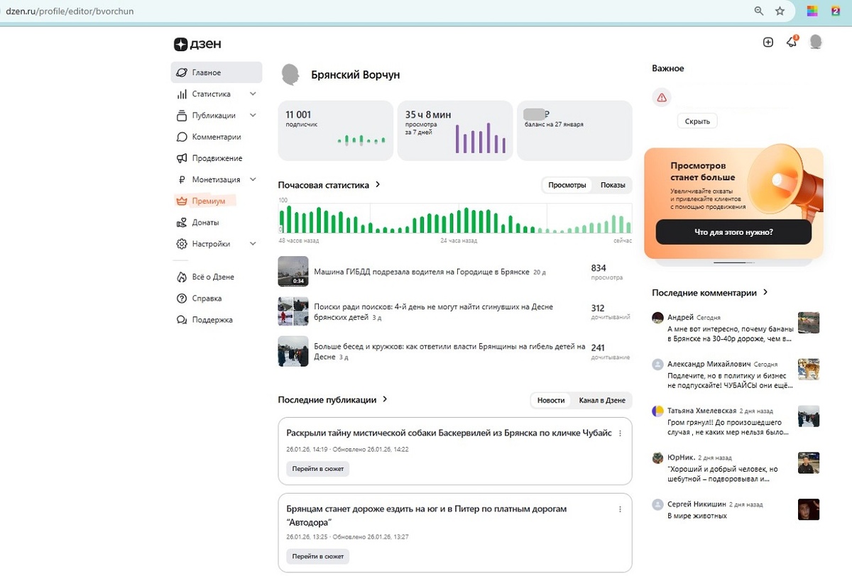 Ядро аудитории Дзен-канала «Брянский ворчун» превысило 11 000 подписчиков