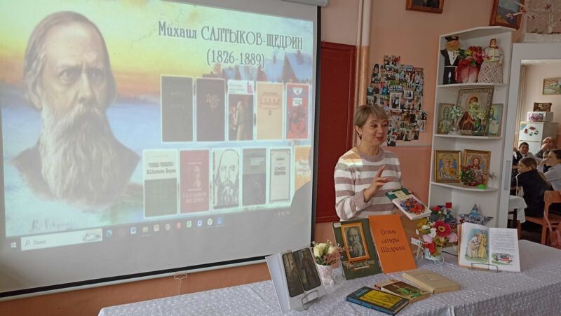 Творчество Салтыкова-Щедрина занимает почетное место в русской и мировой литературе. Им по праву гордится наша Родина, как одним из выдающихся своих сынов, мужественным борцом за свободу и счастье народа. Детская библиотека-филиал № 5 провела для учащихся МБОУ СОШ № 5 с кадетскими классами имени А. Т. Губина литературный гид «Его именем названы улицы и библиотеки», приуроченный к 200-летию со дня рождения выдающегося русского писателя-сатирика Михаила Евграфовича Салтыкова-Щедрина. Слушатели познакомились с творчеством писателя с его сатирическим талантом, тонким юмором и глубокими размышлениями о власти, обществе и человеческой натуре. Вспомнили самые популярные и полюбившиеся сказки Салтыкова-Щедрина. Вызвала неподдельный интерес эстафета громких чтений «Сказки вслух» по произведению «Верный Трезор». С помощью виртуальной презентации «В честь Салтыкова-Щедрина» учащиеся прошлись по улицам городов Волгограда, Липецка, Орла, Твери и других городов России, где упоминается имя писателя.