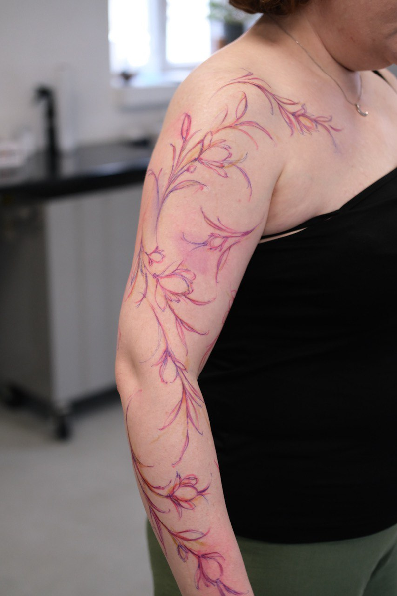 Меня зовут Лиза. Я тату-художник из Москвы, и моя вселенная это объемная, воздушная ботаника. Цветы, ветви и стебли, которые будто дышат и двигаются вместе с телом. Мне часто пишут «а можно заранее посмотреть эскиз?» И мой ответ обычно удивляет: «Финальный эскиз рождается прямо на вашем теле.» Сегодня расскажу, почему я принципиально не работаю с готовыми шаблонами и создаю каждую татуировку в технике freehand — рисую от руки маркером сразу на коже. Мы привыкли думать об эскизе как о рисунке на плоском листе.
