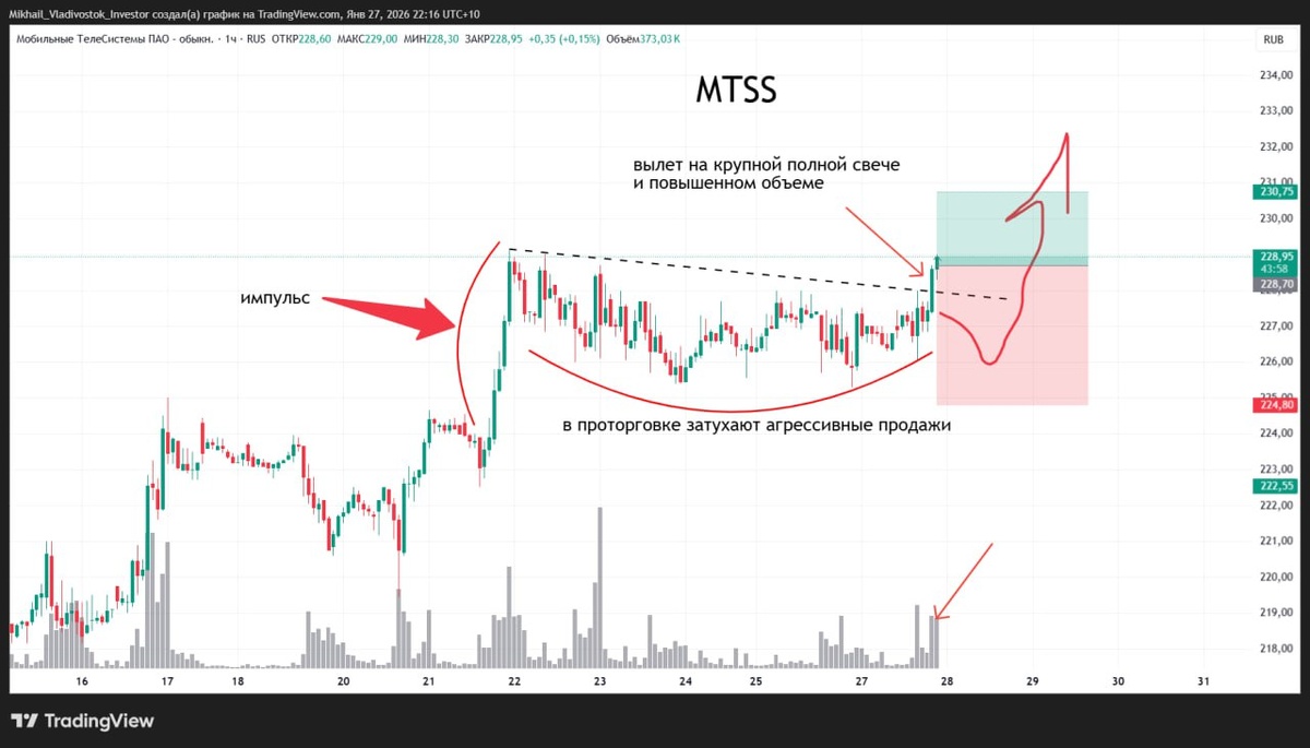 Цена: 228.70 Стоп: 224,89 под проторговку, которая служит поддержкой Риск: 1% от депо Причины: 1. Восходящий тренд на дневном таймфрейме 2. Мы в зоне крупных покупок(импульс) 3. В проторговке продажи затухают 4. Топлива достаточно чтобы лететь выше 5. Пробой вверх на крупной полной свече и повышенном объеме В видео обзоре так же говорил про данную акцию 📺 https://youtu.be/sQZ6Q0pS7rE 😃 https://vkvideo.ru/video-226907663_456239299 Ну и не забываем, что это рынок и может пойти все не по плану. Если цена пойдет не в мою сторону, я потеряю всего лишь один 1% от депо. Дисциплина наше ВСЁ 😉 помните об этом #мтс #идея #лонг #mtss