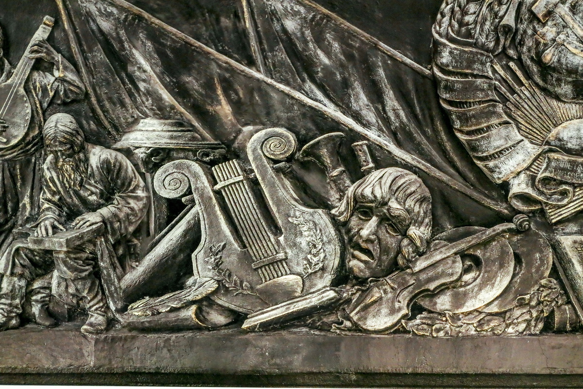 — В процессе корректировок проекта здания барельеф, который должен был быть на виду и поражать зрителей своим масштабом, оказался закрыт колоннами. Нет такого ракурса, с которого можно увидеть всё 22-метровое изваяние целиком. Нет такой точки, с которой мы бы увидели хотя бы его половину. В первоначальном проекте над входной группой, где сейчас размещается барельеф, находилось окно.