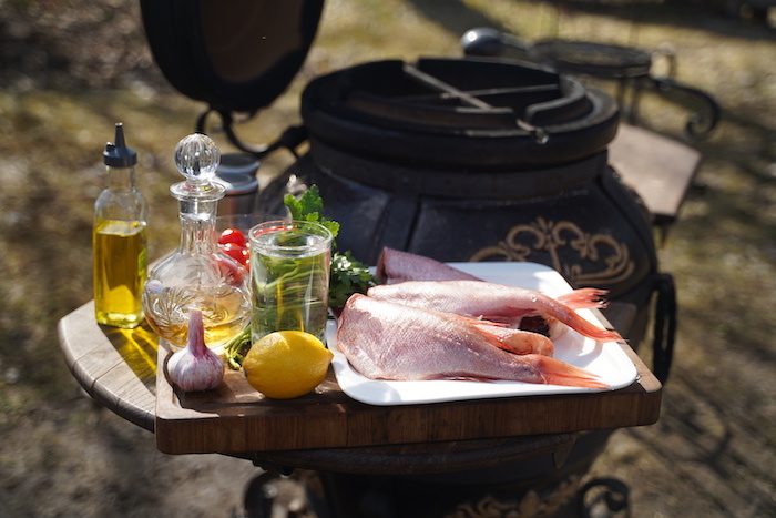 Приготовим Аква Пацца в казане на этапе разогрева тандыра Гранд вместе с Олегом Ольховым Шаг1. Нарезать кубиками помидоры, измельчить чеснок, мелко нарезать петрушку. Шаг2. Поставить казан или садж на открытый огонь тандыра. На среднем огне разогреть оливковое масло, добавить чеснок и обжарить до золотистого цвета. Добавить помидоры. Шаг3. Добавить вино и воду, довести до кипения. Шаг4. Посолите и поперчите филе рыбы, затем аккуратно положите его в казан. Накрыть крышкой и тушить на медленном огне около 10-15 минут. Шаг5. Посыпать готовую рыбу петрушкой и подавать с дольками