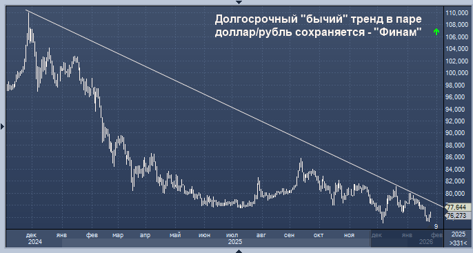 Долгосрочный "бычий" тренд в паре доллар/рубль сохраняется - "Финам" Курс доллара к рублю расчётный, фьючерс, вечный фьючерс и межбанк. Курс евро к рублю расчётный, фьючерс, вечный фьючерс и межбанк. Курс юаня к рублю биржевой, фьючерс, вечный фьючерс и межбанк. Долгосрочный "бычий" тренд в паре доллар/рубль сохраняется, считает аналитик инвесткомпании "Финам" Николай Дудченко. На прошлой неделе курс пары доллар/рубль опустился более, чем на 3%, напоминает эксперт в комментарии. На текущей неделе начался отскок. В настоящее время курс находится на отметке 76,5 руб./$1 - курс рубля по-прежнему продолжает оставаться достаточно крепким. На взгляд Дудченко, катализатором очередного витка роста курса могли стать трехсторонние переговоры в Абу-Даби между Украиной, США и Россией. Ожидается, что 01 февраля переговоры будут продолжены. Между тем, судя по той же реакции российского фондового рынка (+1,6% за прошлую неделю по индексу Мосбиржи и -0,7% с начала текущей недели), ожидания рыночных уч