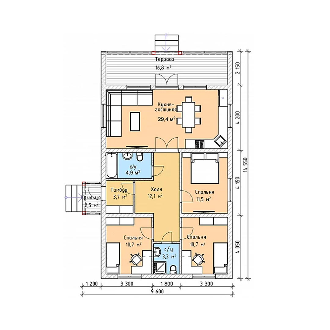 Проект «Карелия» — это одноэтажный каменный дом площадью 104 м², который подойдёт для комфортного загородного проживания. Планировка дома ориентирована на удобство, функциональность и естественное освещение. Центром дома является просторная кухня-гостиная со вторым светом и выходом на террасу. Второй свет наполняет помещение солнечным светом и визуально увеличивает пространство. Терраса отлично подходит для отдыха в тёплое время года и семейных встреч. В доме предусмотрены три спальни, объединённые общим холлом, что удобно для семьи с детьми.
