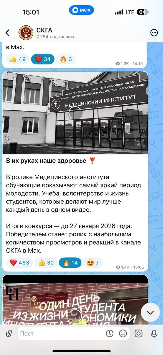 Мы знаем, что вы ждали, и вот подводим итоги конкурса видеороликов, посвященных студенческой жизни в СКГА. Благодарим все институты за активность, креатив и праздничное настроение. Подсчет баллов велся на основе постов с конкурсными видеороликами, опубликованных в официальном канале СКГА в мессенджере Мах. Итоговый результат формировался из суммы просмотров и реакций. Тройка лидеров конкурса: 🥇 Медицинский институт — 1 914 баллов; 🥈 Институт экономики и управления — 1 376; 🥉 Инженерный институт — 1299 баллов. Остальные участники конкурса: ✨ Юридический институт — 1 286 баллов; ✨ Институт цифровых технологий — 1 122 балла; ✨ Аграрный институт — 1 076 баллов; ✨ Институт дизайна и лингвистики — 1 017 балла. Поздравляем лидеров и благодарим все институты за участие, инициативу и творческий подход. 🎁 Призы уже скоро будут вручены.