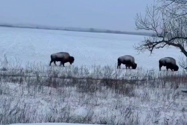 Три больших американских бизона, не обращая внимание на изумленных зрителей и проезжающие машины спокойно бредут по полю вдоль трассы, ища под слоем снега пропитание. Животные будто находятся в привычной обстановке, и их совершенно не пугают люди. Многие пользователи в сети предположили, что бизоны могли сбежать из зоопарка. Однако рядом с местом их обнаружения зоопарков нет.