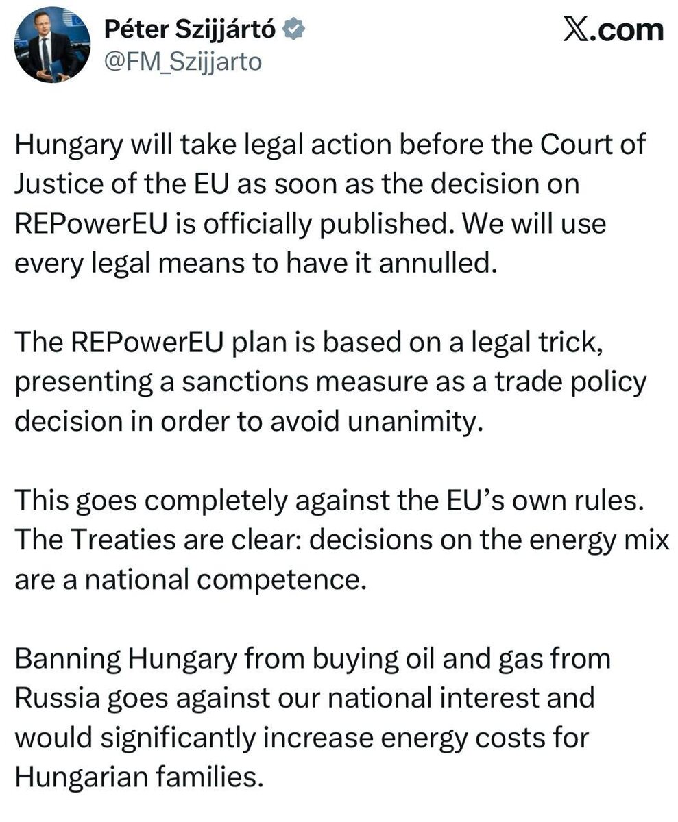 : «Венгрия подаст иск в Суд Европейского союза сразу после официальной публикации решения по плану REPowerEU. Мы используем все юридические средства, чтобы добиться его отмены. План REPowerEU основан на правовой уловке: санкционную меру выдают за решение в сфере торговой политики, чтобы обойти требование единогласия. Это полностью противоречит собственным правилам ЕС. Договоры чётко устанавливают: вопросы энергетического баланса относятся к национальной компетенции. Запрет Венгрии на закупки нефти и газа из России противоречит нашим национальным интересам и приведёт к значительному росту затрат на энергию для венгерских семей». 🤗 НАСОНОВ 🔴