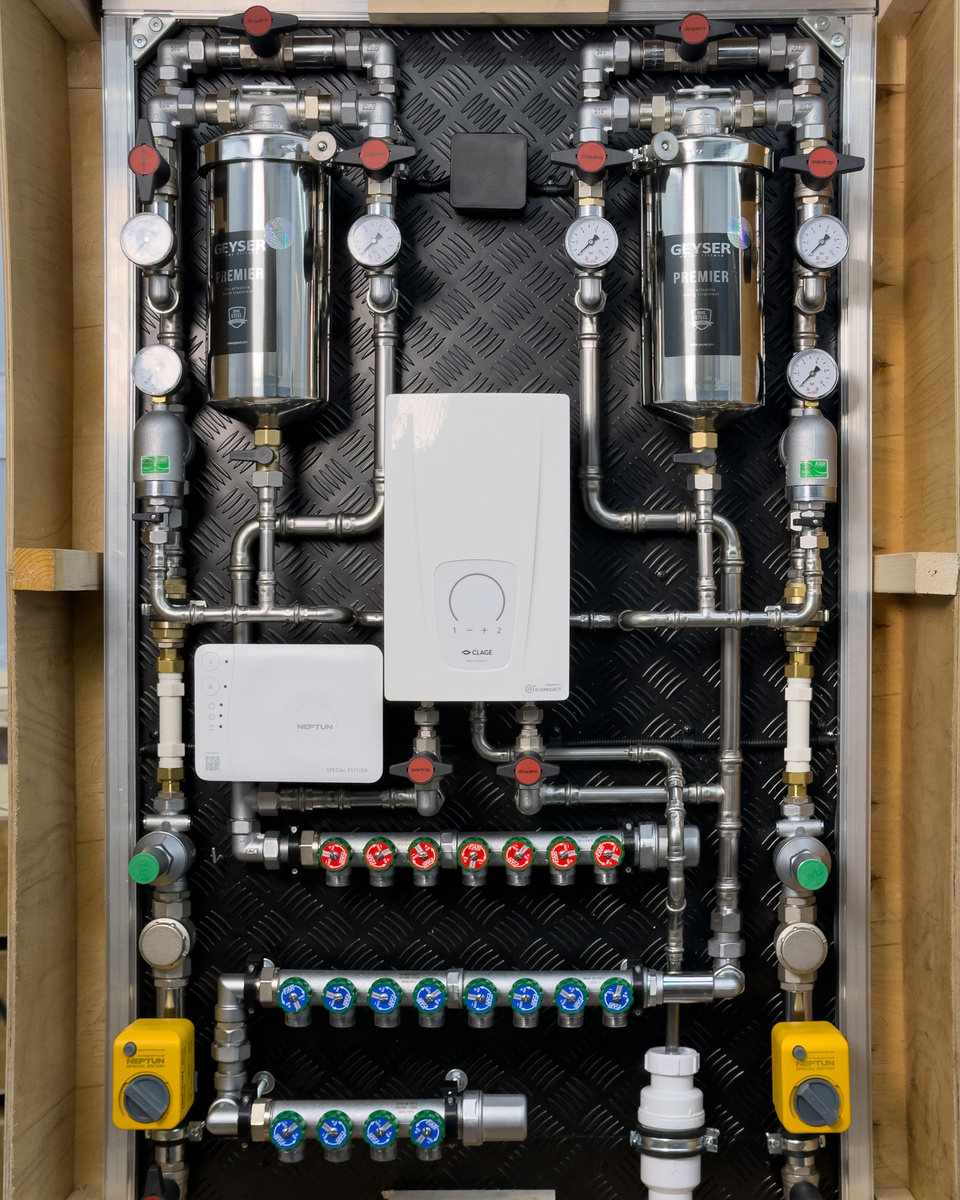 Каждый сантиметр пространства использован осмысленно: трассы не пересекаются хаотично, узел читается визуально, доступ к обслуживанию сохранён. Такое решение требует больше инженерной работы, больше фитингов, больше расчётов. Узел становится дороже в сборке — но зато позволяет сохранить полезное пространство квартиры. А сегодня это, пожалуй, самый дорогой ресурс. Одна из ключевых особенностей — магистральные фильтры с байпас