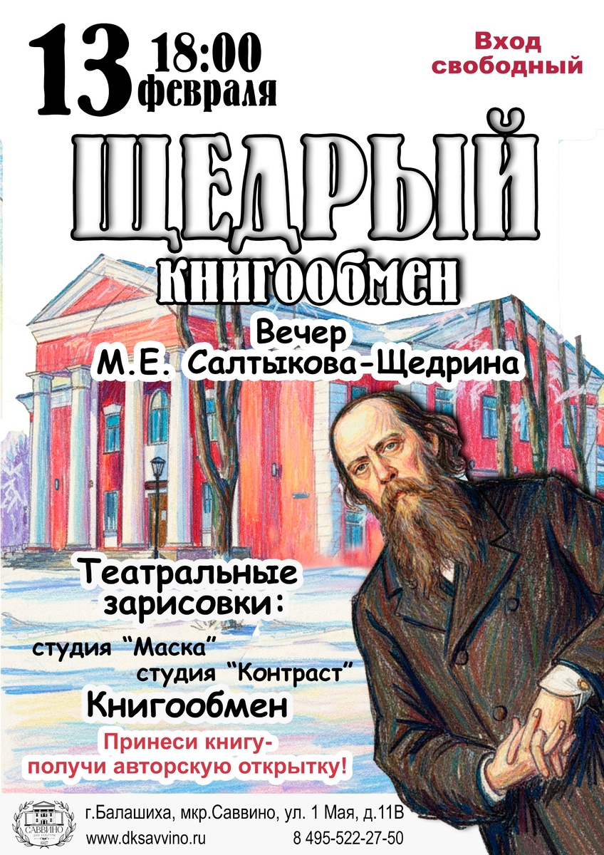 »! 📘 Когда? 13 февраля в 18:00. Где? ДК «Саввино». 📚 Что вас ждёт: - Щедрый книгообмен, посвящённый творчеству и жизни М. Е. Салтыкова-Щедрина. - Театральные зарисовки от студий «Маска» и «Контраст». - Акция «Принеси книгу — получи авторскую открытку»! 🔔 Вход свободный! Это отличная возможность: - познакомиться с интересными книгами; - насладиться яркими театральными зарисовками; - обменяться литературой и получить уникальную открытку. И просто познавательно и интересно провести вечер! Приходите сами и зовите друзей! Давайте вместе отметим творческое наследие великого писателя📚