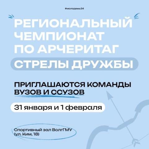 Волгоградский медицинский университет проведет состязания по арчери тагу. Проект при поддержке Росмолодежи реализует студентка ВолгГМУ Яна Новаковская. Как сообщили РИАЦ в Молодежном центре Волгоградской области, учащимся вузов и ссузов организаторы предлагают собрать команды из 7 человек, 5 из которых будут основными, а 2 – запасными игроками, зарегистрировать свои сборные и прибыть с спортивный зал медицинского университета (ул. Ким, 18), чтобы сразиться и победить в испытаниях, совмещающих элементы вышибал, пейнтбола и стрельбы из лука, но с безопасными мягкими наконечниками. Турнир по Archery Tag «Стрелы дружбы» пройдет в течение двух дней, 31 января и 1 февраля 2026 года. Начало игр – в 14.00. Инструктаж проведут раньше.