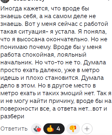 Вот у меня сейчас с работой такая ситуация- я устала. Я поняла, что я высосана окончательно. Но не понимаю почему. Вроде бы у меня работа спокойная, лояльный начальник. Но что-то не то. Думала просто ехать далеко, уже в метро идешь и плохо становится. Думала дело в этом. Но в другое место в метро ехать и таких эмоций нет. Так я и не могу найти причину, вроде бы на поверхности все, а ответа нет...вот и разбери."